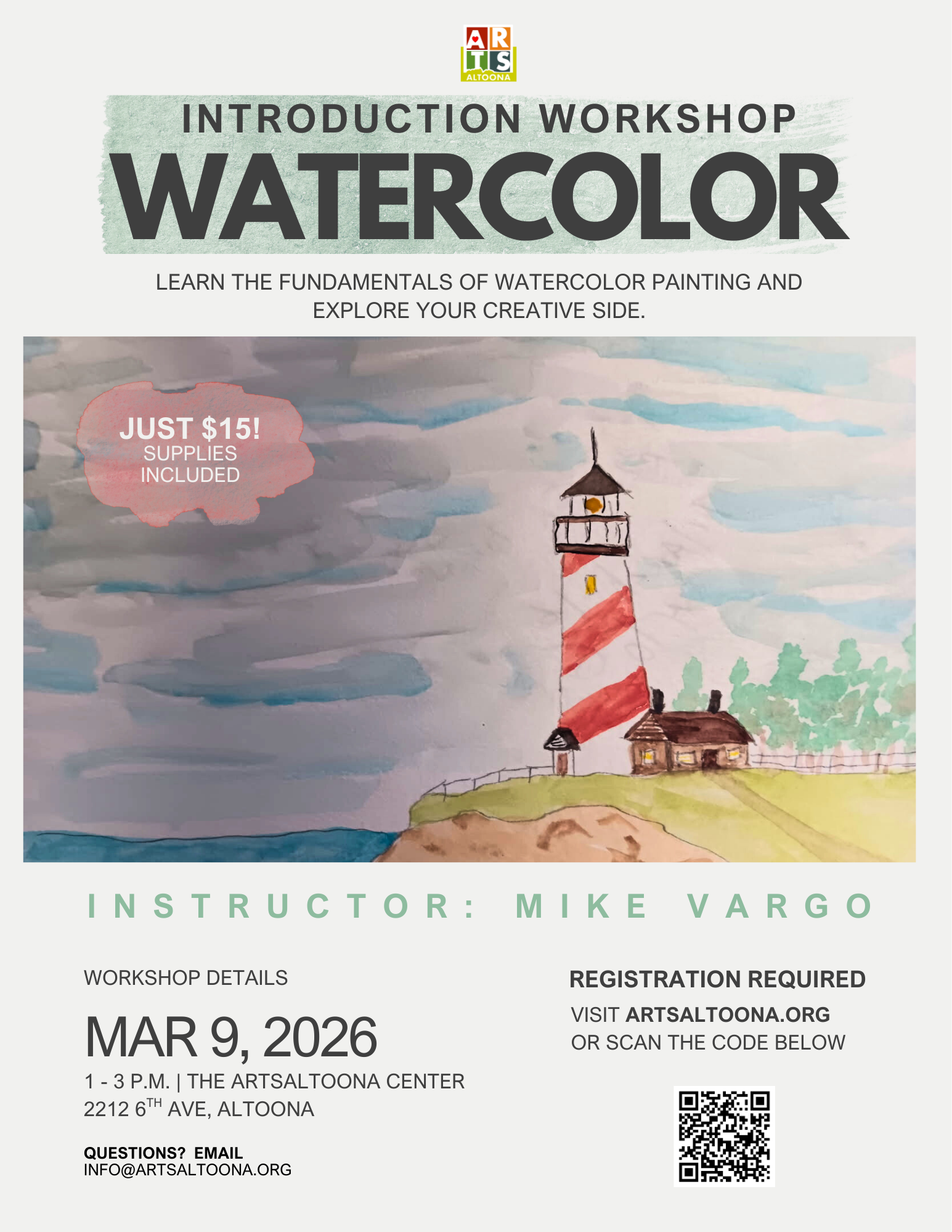 Curious about watercolor painting? Join us for an introductory watercolor workshop led by artist Mike Vargo at the ArtsAltoona Center. This hands on session is perfect for beginners or anyone looking to explore watercolor in a relaxed, supportive setting.